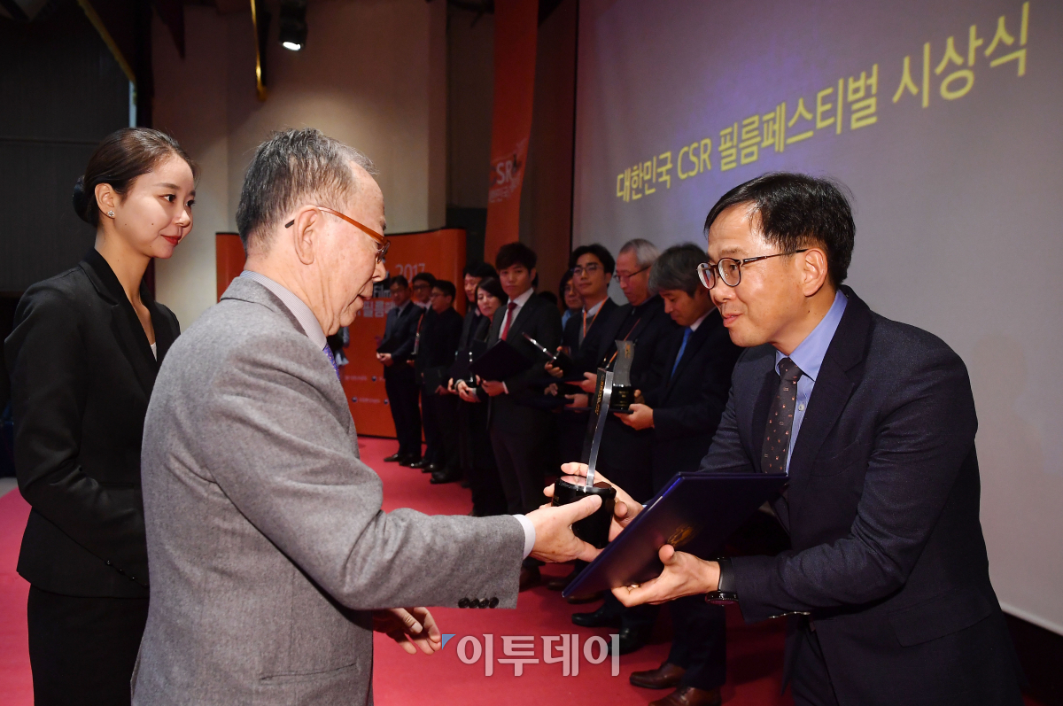 이헌재 2017 대한민국 CSR 필름페스티벌 대회위원장이 30일 서울 여의도 사학연금회관 대강당에서 열린 대한민국 CSR필름페스티벌에서 국무총리상을 수상한 GS칼텍스의 이상훈 상무에게 상패와 상장을 전달하고 있다. 이동근 기자 foto@