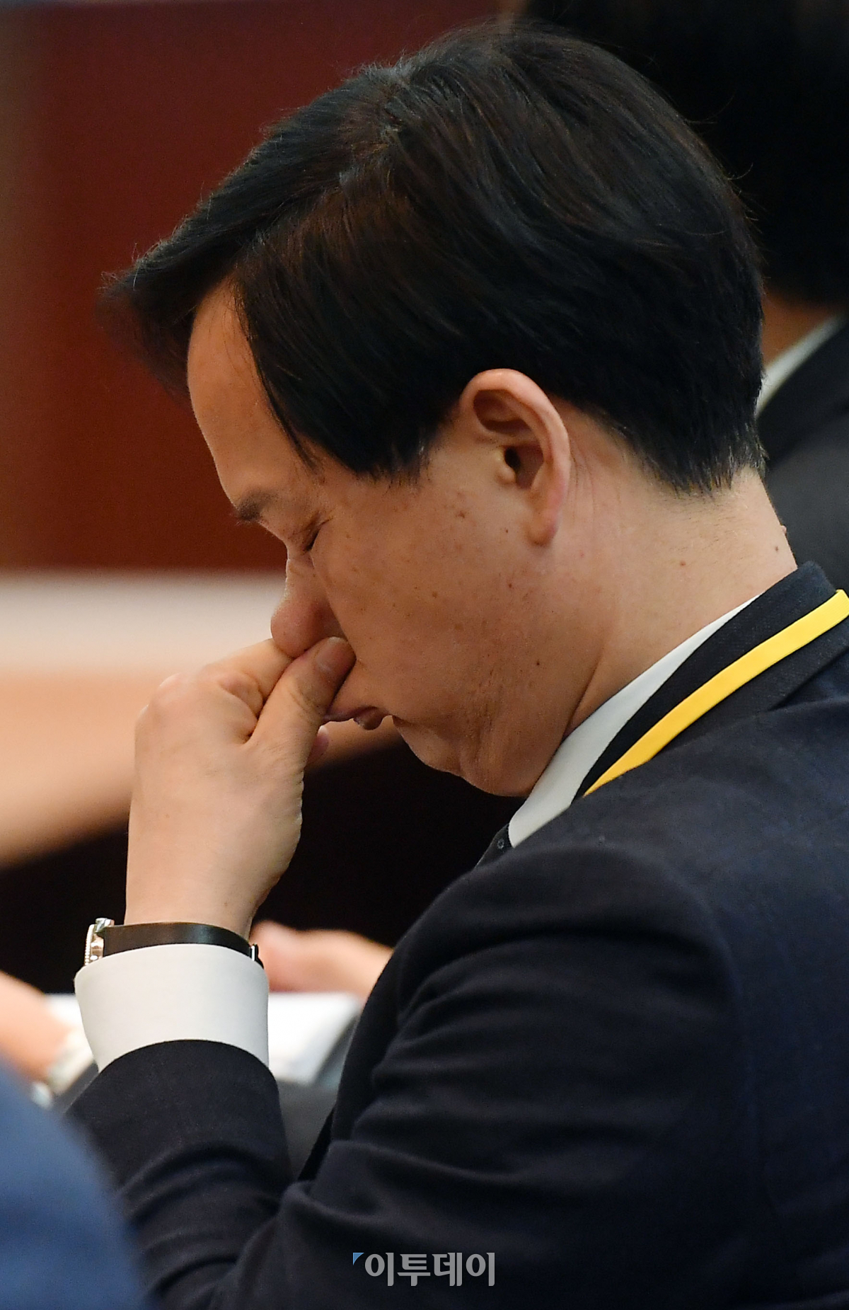 강성천 산업통상자원부 통상차관보가 1일 서울 강남구 코엑스에서 열린 한미 FTA 개정 관련 제2차 공청회에서 얼굴을 매만지고 있다. 이동근 기자 foto@