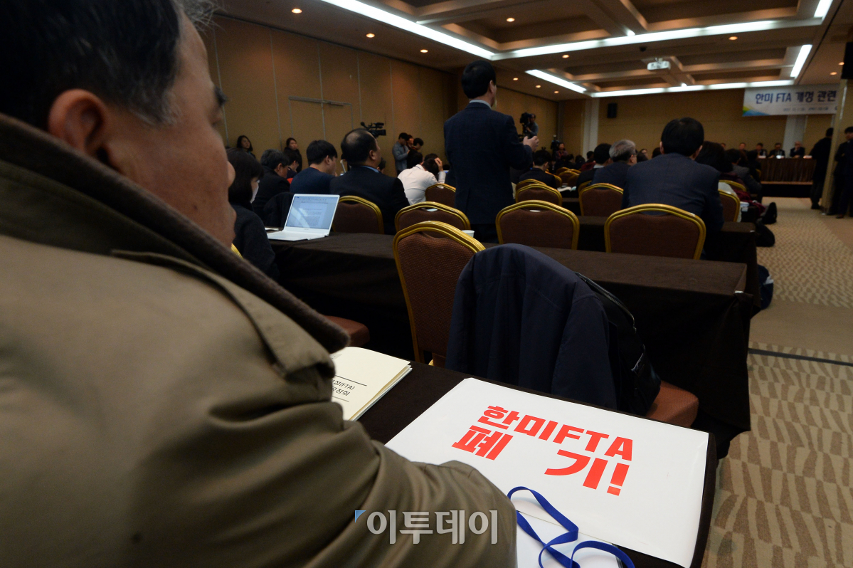 1일 서울 강남구 코엑스에서 열린 한미 FTA 개정 관련 제2차 공청회에서 한 참석자가 '한미FTA 폐기'라고 적힌 손 팻말을 책상에 올려놓은 채 패널토론을 듣고 있다. 이동근 기자 foto@