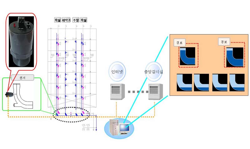이 시스템은 지하 배관에 실시간 배수상태를 감시하는 특수 센서를 설치해 오수가 일정 수위를 넘으면 관리실에 경보가 울려 하자보수를 요청한다.