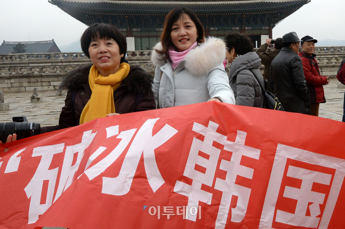 중국 정부의 한국 단체관광 일부 허용 이후 첫 유커(游客·중국인 단체 관광객)들이 3일 서울 경복궁에서 '破冰韩国 首发团(파빙한국 첫단체)'라고 적힌 현수막을 들고 기념촬영을 하고 있다. 지난 3월 15일 내려진 한국 단체 관광상품 판매 금지 조치 이후 '1호 단체 비자 관광객'들인 이들은 서울, 경기의 주요 명소와 시내 면세점 등을 방문한다. 이동근 기자 foto@