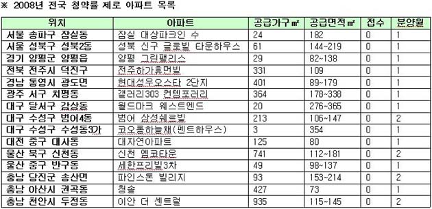 새해 전국에서 분양중인 아파트 가운데 청약접수가 단 1건도 성사되지 않은 이른바 '청약 0%'아파트는 15개 사업장, 3800여가구로 집계됐다.