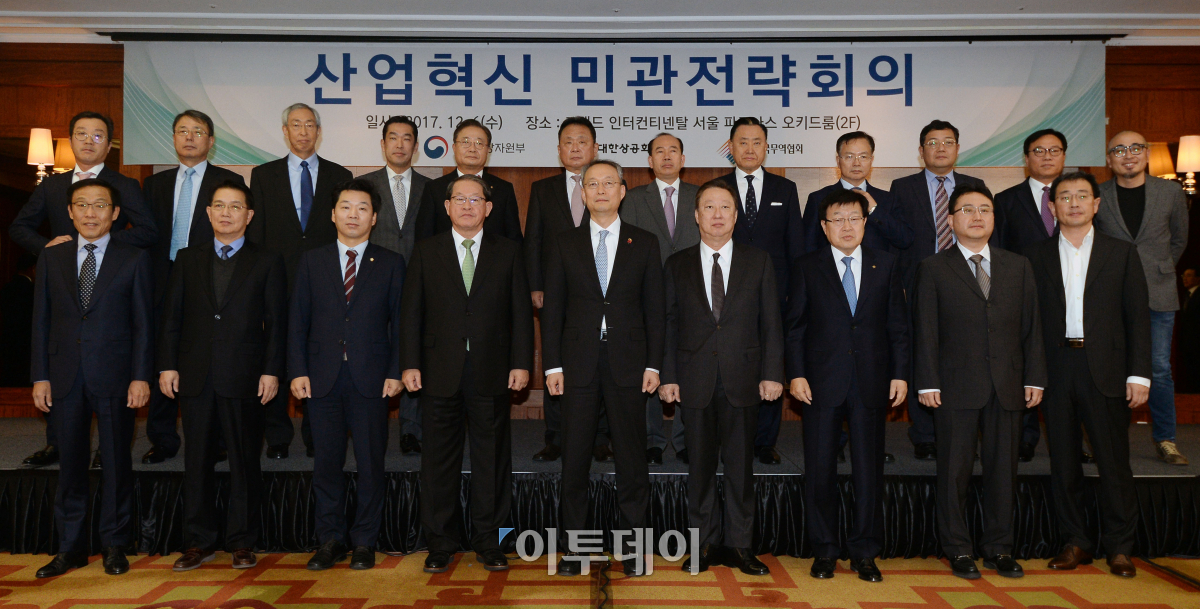 백운규(앞줄 가운데)산업통상자원부 장관, 박용만(앞줄 오른쪽에서 네 번째) 대한상공회의소 회장, 김영주(앞줄 오른쪽에서 세 번째) 한국무역협회장이 6일 오전 서울 강남구 그랜드인터컨티넨탈 호텔에서 열린 산업혁신 민관전략회의에서 참석자들과 기념촬영을 하고 있다. 이동근 기자 foto@