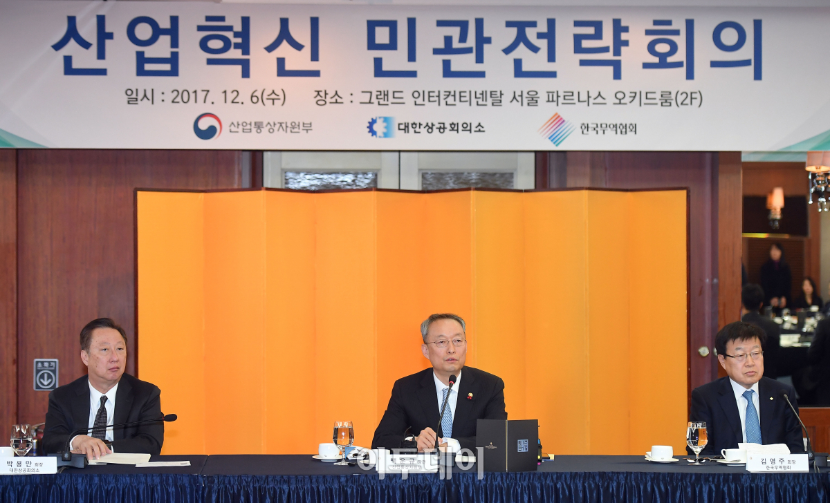 백운규(가운데) 산업통상자원부 장관이 6일 오전 서울 강남구 그랜드인터컨티넨탈 호텔에서 열린 산업혁신 민관전략회의에서 인사말을 하고 있다. 이동근 기자 foto@