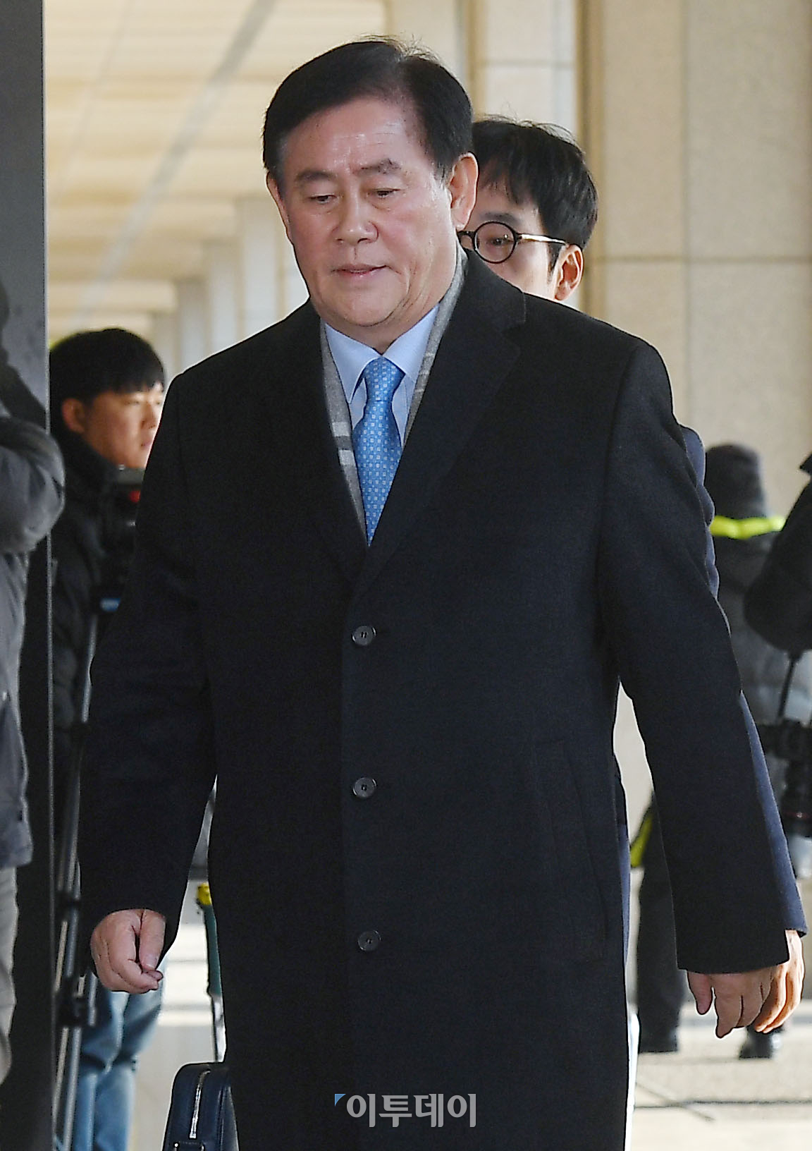 경제부총리 시절 국정원 특수활동비 1억 원을 수수한 혐의를 받고 있는 최경환 자유한국당 의원이 6일 오전 서울 서초구 중앙지검에 피의자 신분으로 출석하고 있다. 앞서 최 의원은 세 차례나 검찰의 소환통보를 받았지만 모두 불응, 네 번째 소환 만에 검찰청사에 모습을 드러냈다. 이동근 기자 foto@