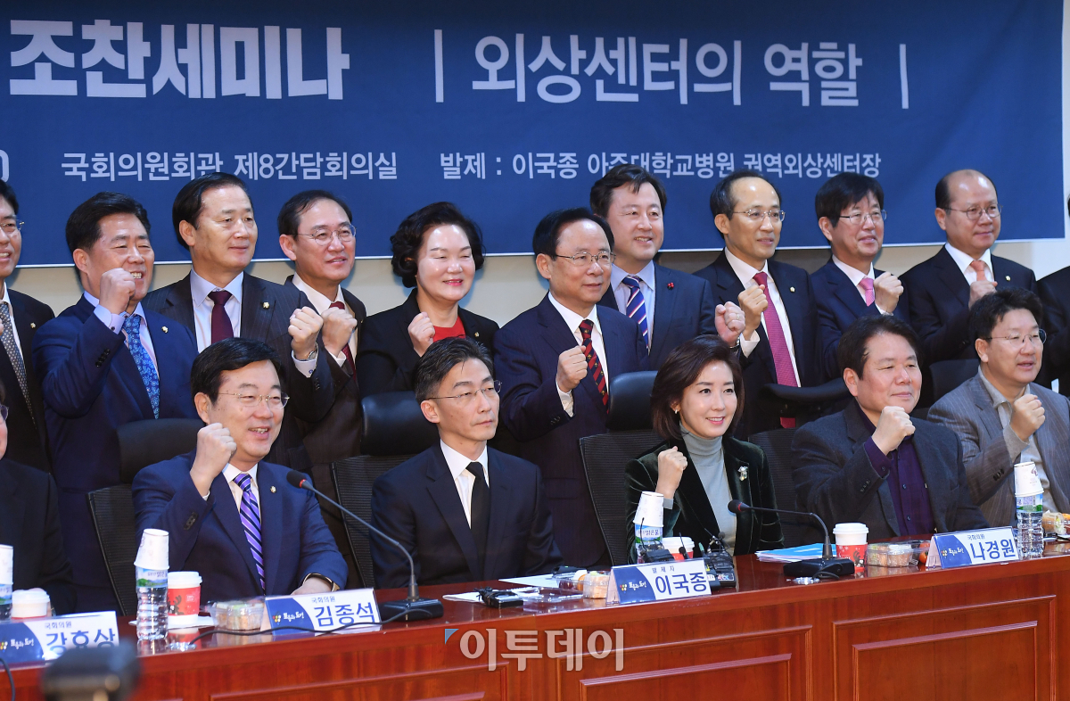 이국종(앞줄 왼쪽에서 두 번째) 아주대병원 권역외상센터장이 7일 오전 서울 여의도 국회 의원회관에서 열린 포용과 도전 제 18차 조찬세미나에서 참석한 국회의원들과 기념촬영을 하고 있다. 이동근 기자 foto@