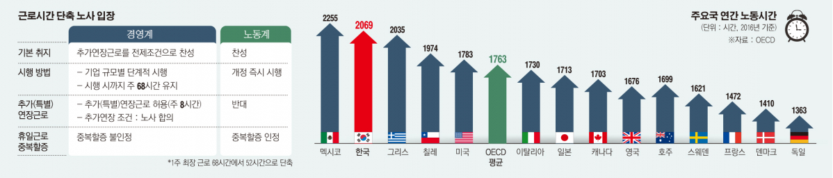 이에 따라 현재 주당 최대 근로시간이 주 40시간+평일 연장근로 12시간+휴일근로 16시간으로 총 68시간까지 가능하다는 행정해석을 유지하고 있다. 이런 법·제도적 혼란에 우리나라 임금근로자의 연간근로시간이 경제협력개발기구(OECD) 평균(1706시간)보다 350시간이나 많다는 사실 등이 사회적 문제로 대두됐다.