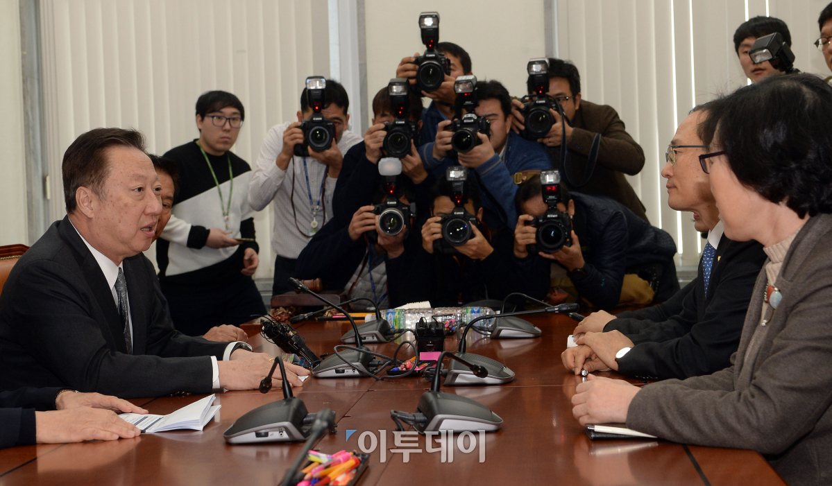 박용만(왼쪽) 대한상공회의소 회장이 7일 서울 여의도 국회에서 홍영표 환경노동위원장 및 여야 간사들과 최근 노동계 현안에 관한 경제계의 입장을 전달하고 있다. 이동근 기자 foto@