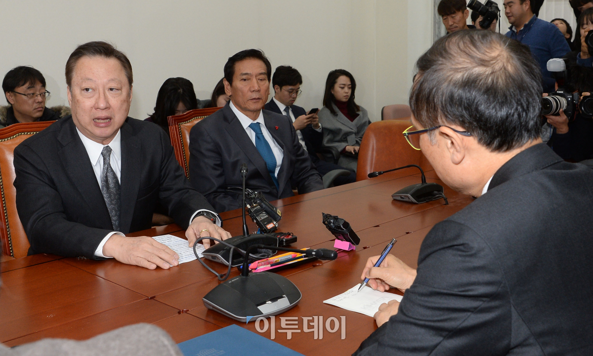박용만 대한상공회의소 회장이 7일 서울 여의도 국회에서 홍영표 환경노동위원장 및 여야 간사들과 만나 최근 노동계 현안에 관한 경제계의 입장을 전달하고 있다. 이동근 기자 foto@