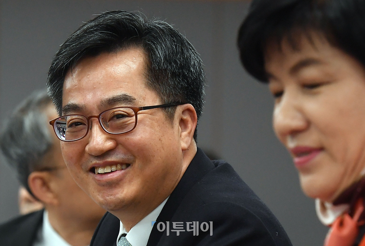 김동연 경제부총리 겸 기획재정부 장관이 8일 오전 서울 종로구 정부서울청사에서 열린 산업경쟁력 강화 관계장관회의 시작에 앞서 미소짓고 있다. 이동근 기자 foto@