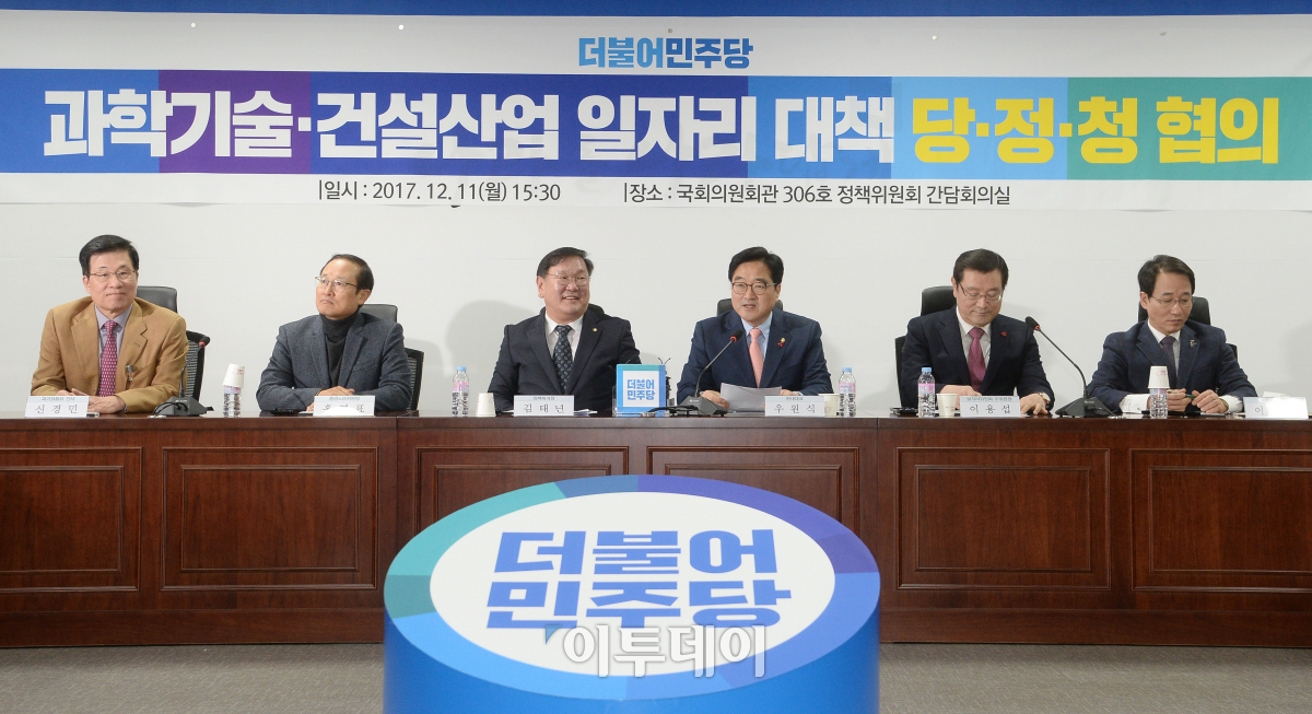 우원식(오른쪽에서 세 번째) 더불어민주당 원내대표가 11일 서울 여의도 국회에서 열린 과학기술·건설산업 일자리대책 당정청협의에서 모두발언을 하고 있다. 이동근 기자 foto@
