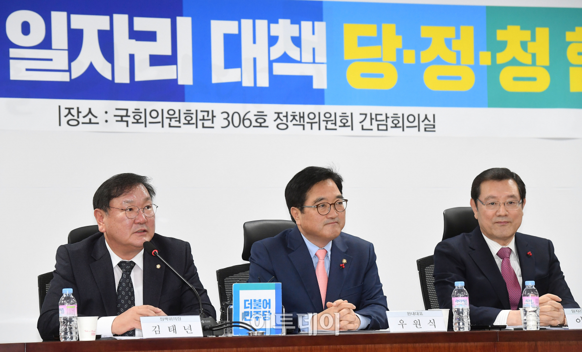 김태년 더불어민주당 정책위의장이 11일 서울 여의도 국회에서 열린 과학기술·건설산업 일자리대책 당정청협의에서 모두발언을 하고 있다. 이동근 기자 foto@