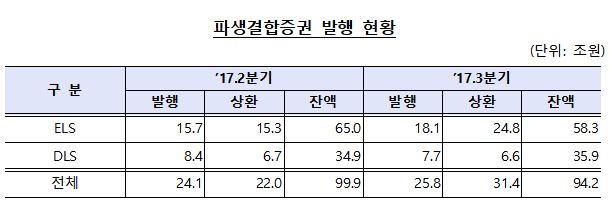 12일 금융감독원에 따르면 3분기 말 기준 파생결합증권 발행잔액은 94조2000억 원으로 직전 2분기(99조9000억 원)보다 5조7000억 원(5.7%) 줄었다. 이는 발행액 증가분(25조8000억 원)을 상환액 증가분(31조4000억 원)이 상쇄했기 때문이다.