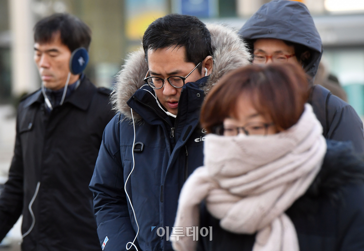서울을 비롯한 수도권에 올 겨울 첫 한파특보가 발효된 12일 오전 서울 세종대로사거리에서 시민들이 두터운 옷을 껴입고 발걸음을 재촉하고 있다. 기상청은 당분간 내륙 중심으로 최저기온이 영하 10도 이하로 떨어지며 추위가 이어질 것으로 예보했다. 이동근 기자 foto@