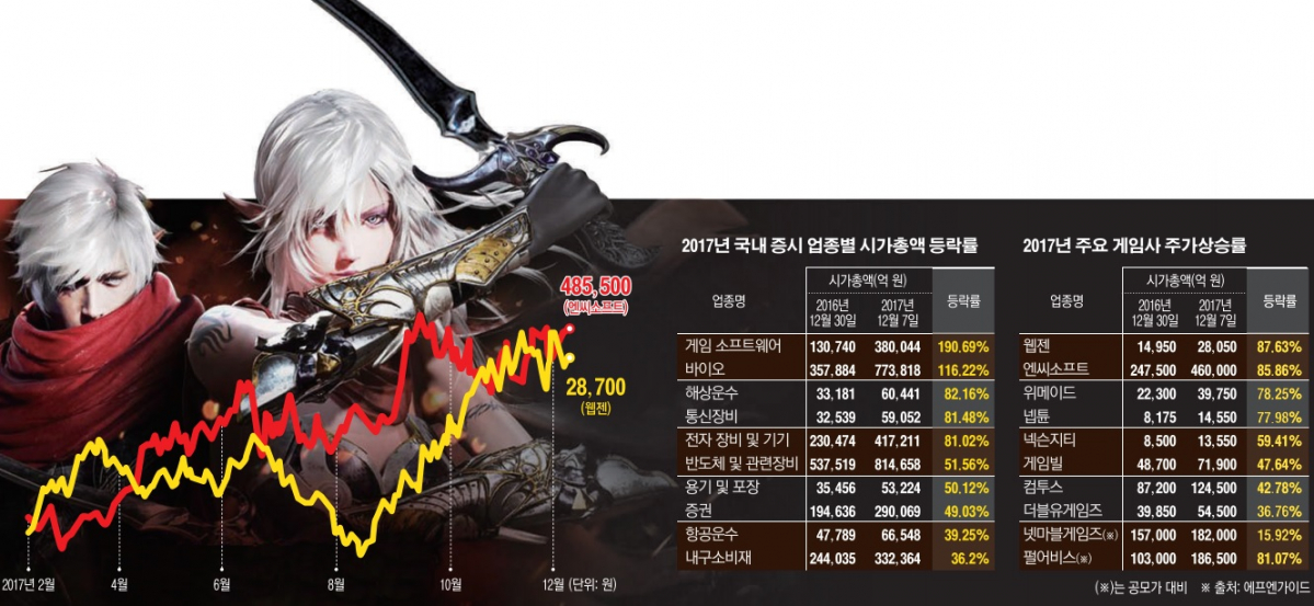 올해 개별 종목의 상승률을 보면 유가증권시장(코스피)에서는 엔씨소프트가 24만7500원에서 46만 원으로 85.86% 증가했다. 코스닥시장에서는 웹젠(87.63%), 위메이드(77.98%), 넵튠(77.98%)으 주가상승률이 두드러졌다. 또 올해 5월 유가증권시장에 간판을 올린 넷마블게임즈가 18만2000원으로 공모가(15만7000원) 대비 15.92%, 9월 코스닥시장에 상장한 펄어비스가 18만6500원으로 공모가(10만3000원)보다 81.07% 오르는 등 새내기주의 활약도 두드러졌다.