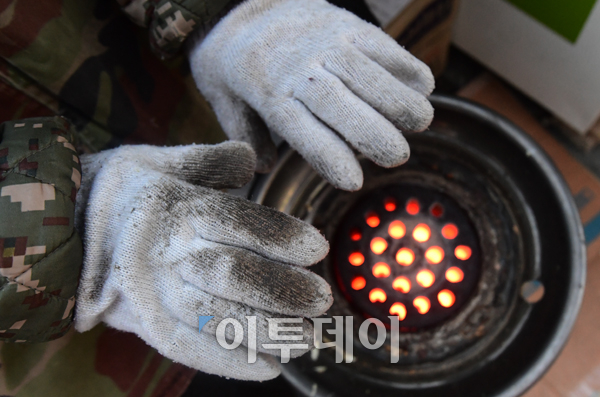 한파가 찾아온 12일 서울 남대문시장의 한 상인이 연탄불에 손을 녹이고 있다. 고이란 기자 photoeran@