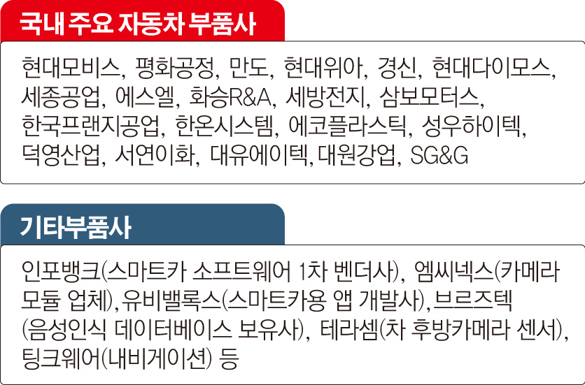 한편 현대모비스 외 주요 부품사는 △만도 △경신 △세종공업 △화승 R&A △삼보모터스 △한온시스템 등을 꼽을 수 있다. 이밖에 관심을 받는 업체는 △인포뱅크(스마트카 소프트웨어 1차 벤더사) △엠씨넥스(카메라모듈 업체) △유비밸록스(스마트카용 앱 개발사) △브르즈텍(음성인식 데이터베이스 보유사) △테라셈(차 후방카메라 센서) △팅크웨어(네비게이션) 등이다.