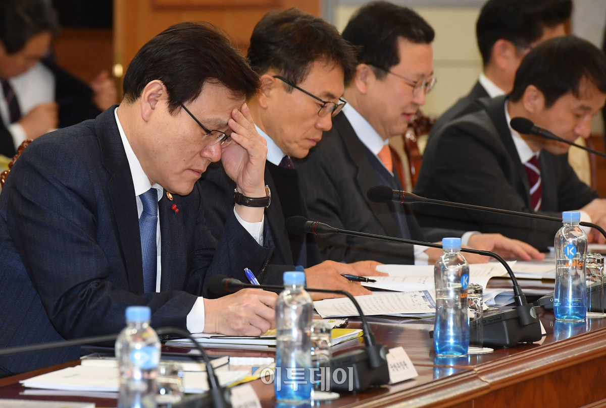 최종구(왼쪽) 금융위원장이 14일 오전 서울 종로구 정부서울청사에서 열린 국정현안점검조정회의에서 자료를 살펴보고 있다. 이동근 기자 foto@