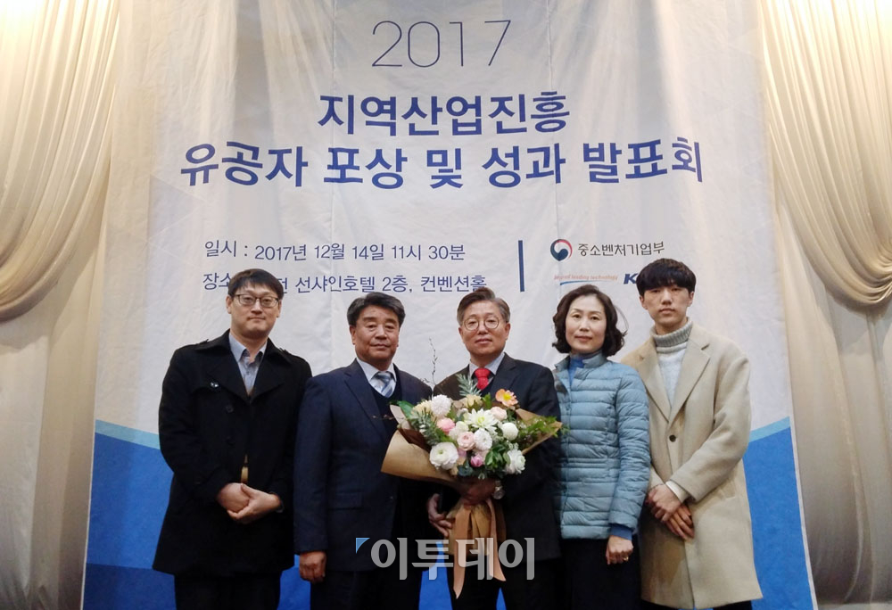 최선강(가운데) 강원대 농생명산업학전공 교수가 14일 대전광역시 호텔 선샤인에서 열린 2017년 지역산업진흥연석협의회에서 “지역산업진흥”공로로 중소벤처기업부 장관상을 수상했다.