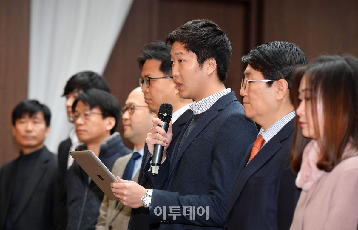 차명훈(오른쪽에서 세 번째) 코인원 대표를 비롯한 가상화폐 거래소 대표들이 15일 오전 서울 중구 은행회관에서 암호화폐 거래소 자율규제안 공동선언문을 발표하고 있다. 이날 (사)한국블록체인협회 준비위원회는 빗썸, 코빗, 코인원 등 국내 3대 가상화폐거래소를 포함해 10여개 국내 가상화폐거래소가 참여하는 자율규제안을 발표했다. 이동근 기자 foto@