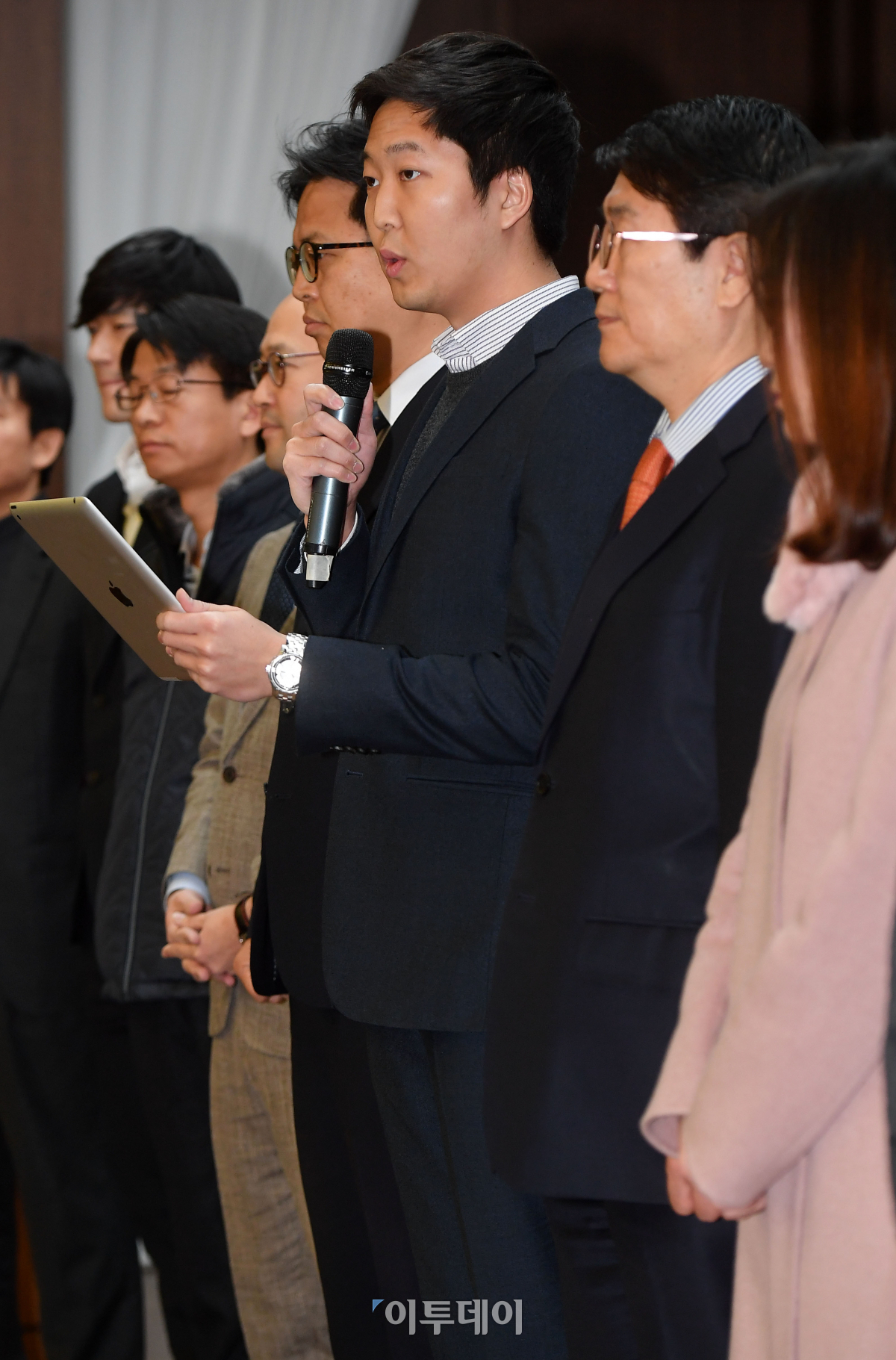차명훈(가운데) 코인원 대표를 비롯한 가상화폐 거래소 대표들이 15일 오전 서울 중구 은행회관에서 암호화폐 거래소 자율규제안 공동선언문을 발표하고 있다. 이날 (사)한국블록체인협회 준비위원회는 빗썸, 코빗, 코인원 등 국내 3대 가상화폐거래소를 포함해 10여개 국내 가상화폐거래소가 참여하는 자율규제안을 발표했다. 이동근 기자 foto@