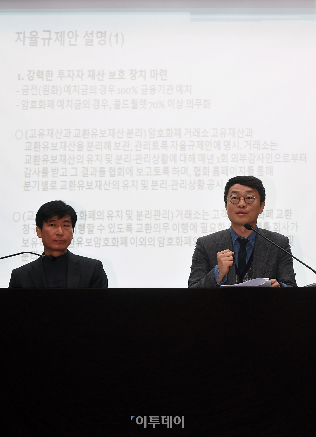 김진화 (사)한국블록체인협회 준비위원회 공동대표가 15일 오전 서울 중구 은행회관에서 암호화폐 거래소 자율규제안을 발표하고 있다. 이날 (사)한국블록체인협회 준비위원회는 빗썸, 코빗, 코인원 등 국내 3대 가상화폐거래소를 포함해 10여개 국내 가상화폐거래소가 참여하는 자율규제안을 발표했다. 이동근 기자 foto@