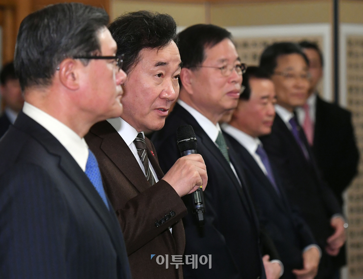 이낙연(왼쪽에서 두 번째) 국무총리가 15일 서울 삼청동 총리공관에서 열린 지속가능발전기업협의회 회원 CEO 오찬간담회에서 인사말을 하고 있다. 이동근 기자 foto@