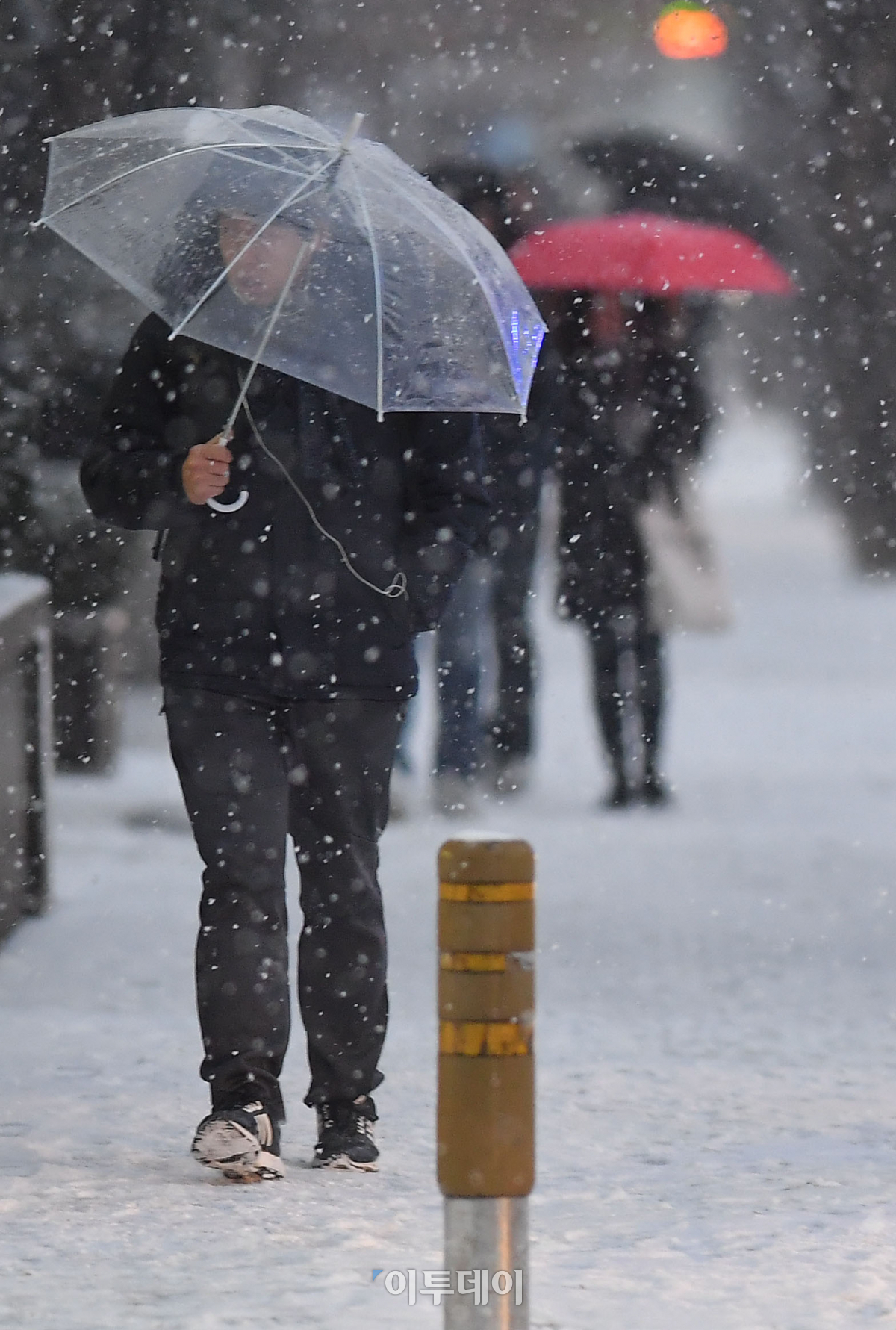 중부지방 곳곳에 함박눈이 내린 18일 오전 서울 국회대로 인근에서 시민들이 발걸음을 서두르고 있다. 기상청은 밤부터 다시 기온이 떨어져 빙판길과 교통혼잡에 주의해야 할 것으로 전망했다. 이동근 기자 foto@