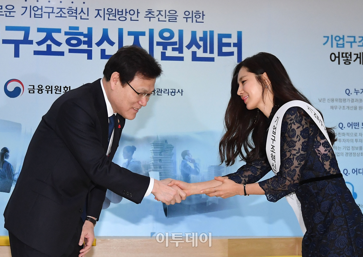 최종구(왼쪽) 금융위원장이 18일 오전 서울 강남구 한국자산관리공사(캠코) 서울지역본부에서 열린 기업구조혁신지원센터 출범식에서 홍보대사로 위촉된 배우 한채아와 악수하고 있다. 이동근 기자 foto@