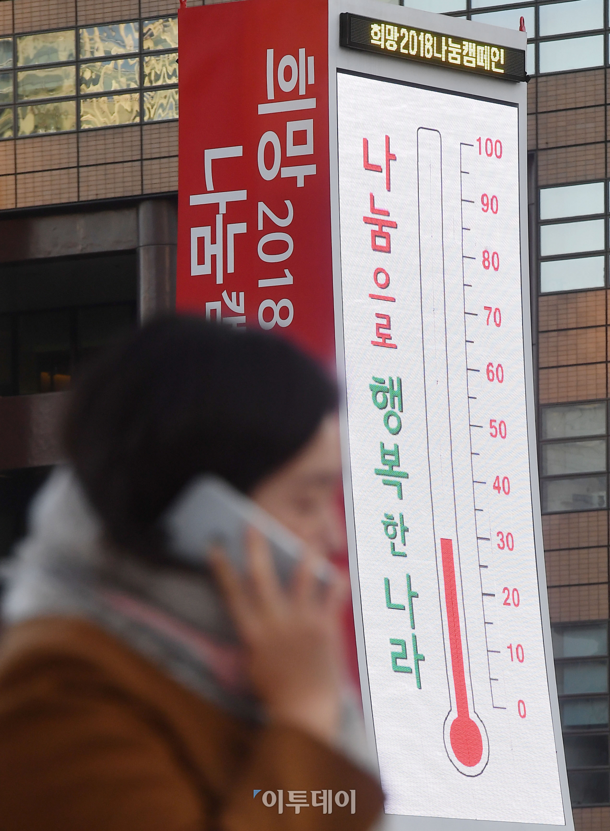 경기 침체와 기부 불신으로 사회복지공동모금회 '사랑의 온도탑' 온도가 예년보다 오르지 않고 있다. 19일 오전 서울 광화문광장에 설치된 사랑의 온도탑 온도가 29.3도를 가리키고 있다. 이날까지 1,169억 원이 모금됐으며, 동기간 대비 30%가량 모금이 부족한 상황이다. 이동근 기자 foto@