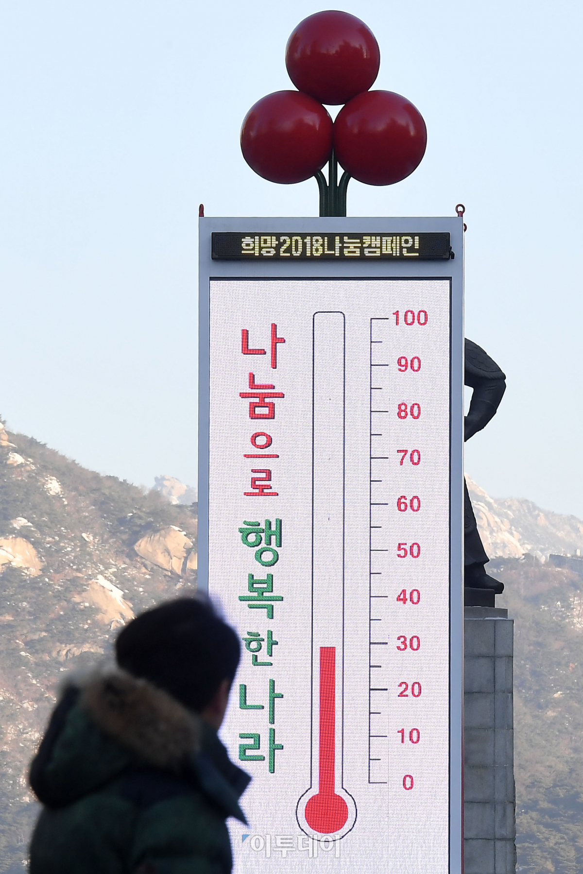 경기 침체와 기부 불신으로 사회복지공동모금회 '사랑의 온도탑' 온도가 예년보다 오르지 않고 있다. 19일 오전 서울 광화문광장에 설치된 사랑의 온도탑 온도가 29.3도를 가리키고 있다. 이날까지 1,169억 원이 모금됐으며, 동기간 대비 30%가량 모금이 부족한 상황이다. 이동근 기자 foto@