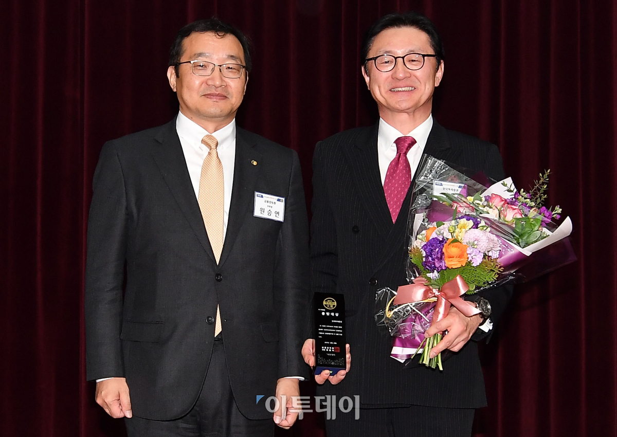 '제7회 올해의 마켓리더 대상' 시상식이 20일 서울 여의도 한국거래소 국제회의장에서 열린 가운데 종합대상을 수상한 한국투자증권의 유상호(오른쪽) 대표이사와 원승연 금융감독원 부원장이 기념촬영을 하고 있다. 이동근 기자 foto@