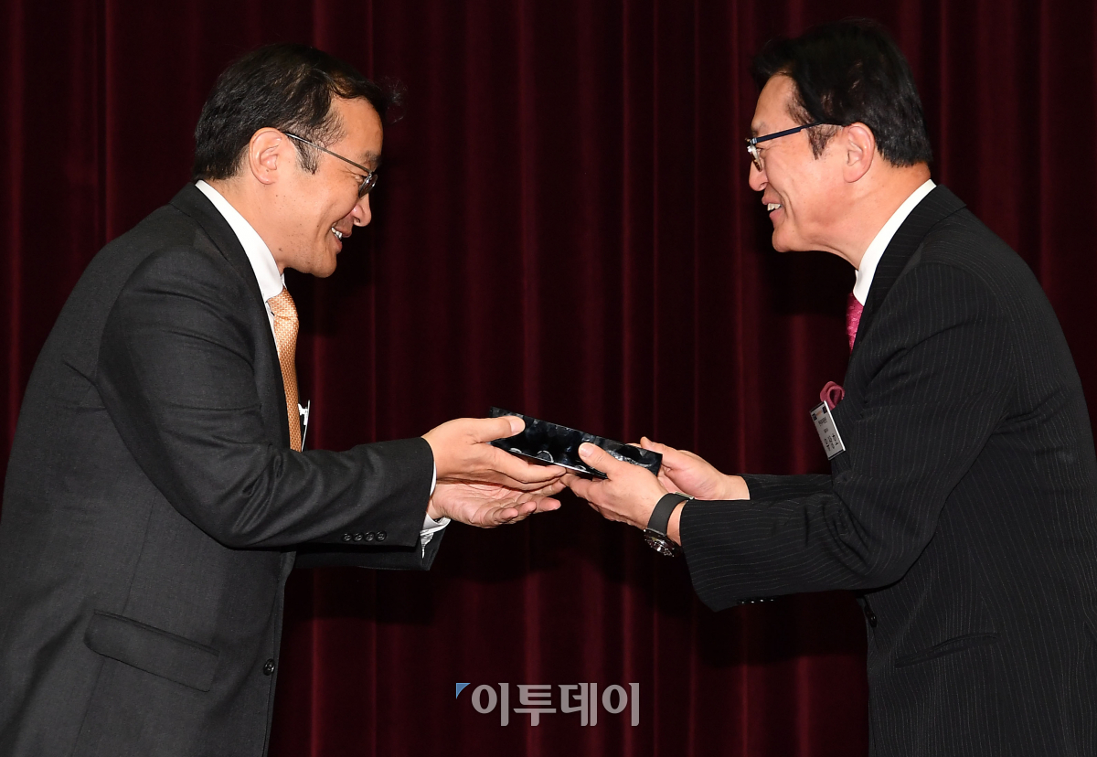 '제7회 올해의 마켓리더 대상' 시상식이 20일 서울 여의도 한국거래소 국제회의장에서 열린 가운데 종합대상을 수상한 한국투자증권의 유상호(오른쪽) 대표이사가 원승연 금융감독원 부원장으로 부터 상패를 받고 있다. 이동근 기자 foto@