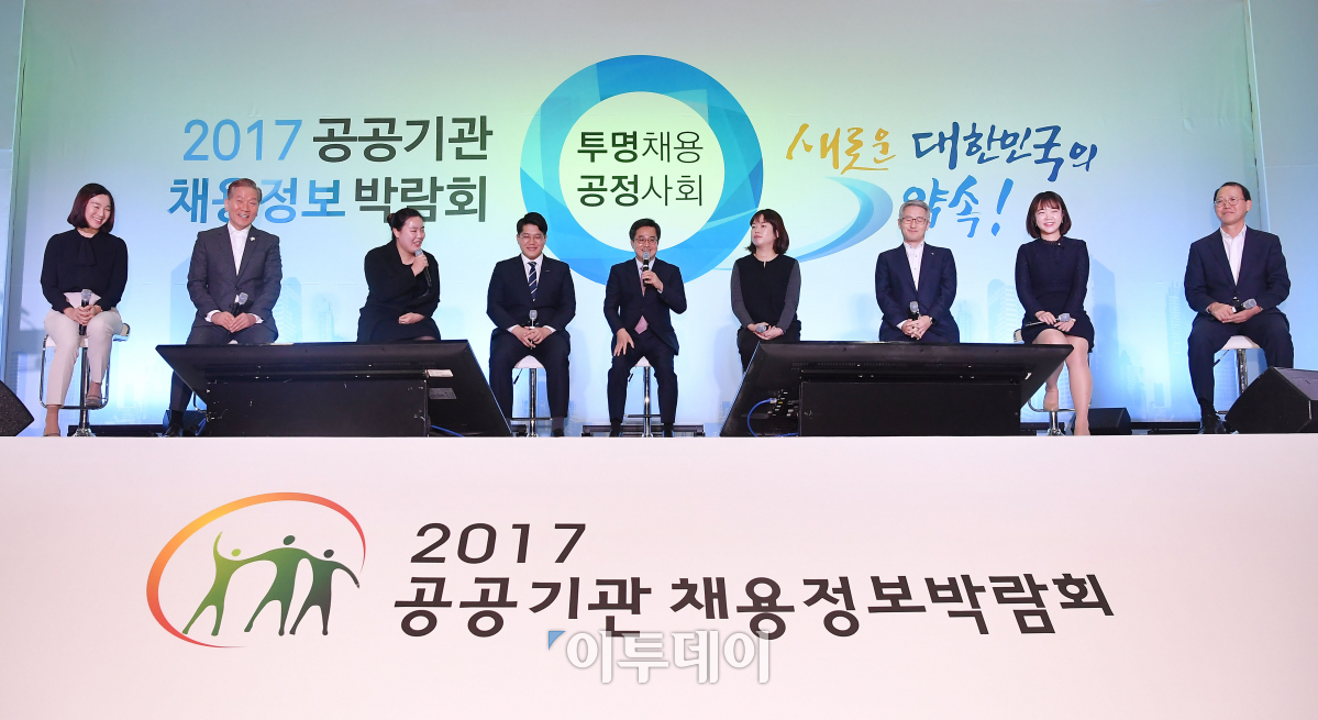김동연(가운데) 경제부총리 겸 기획재정부 장관이 20일 서울 강남구 코엑스에서 열린 2017 공공기관 채용정보 박람회에서 '채용수기 우수자'들과 토크콘서트를 하고 있다. 정부가 마련한 이번 박람회는 한전, 인천국제공항공사, 중소기업은행 등 120여개 주요 공공기관이 참여, 청년 구직자들에게 기관 업무 설명과 채용상담 등의 기회를 제공한다.이동근 기자 foto@