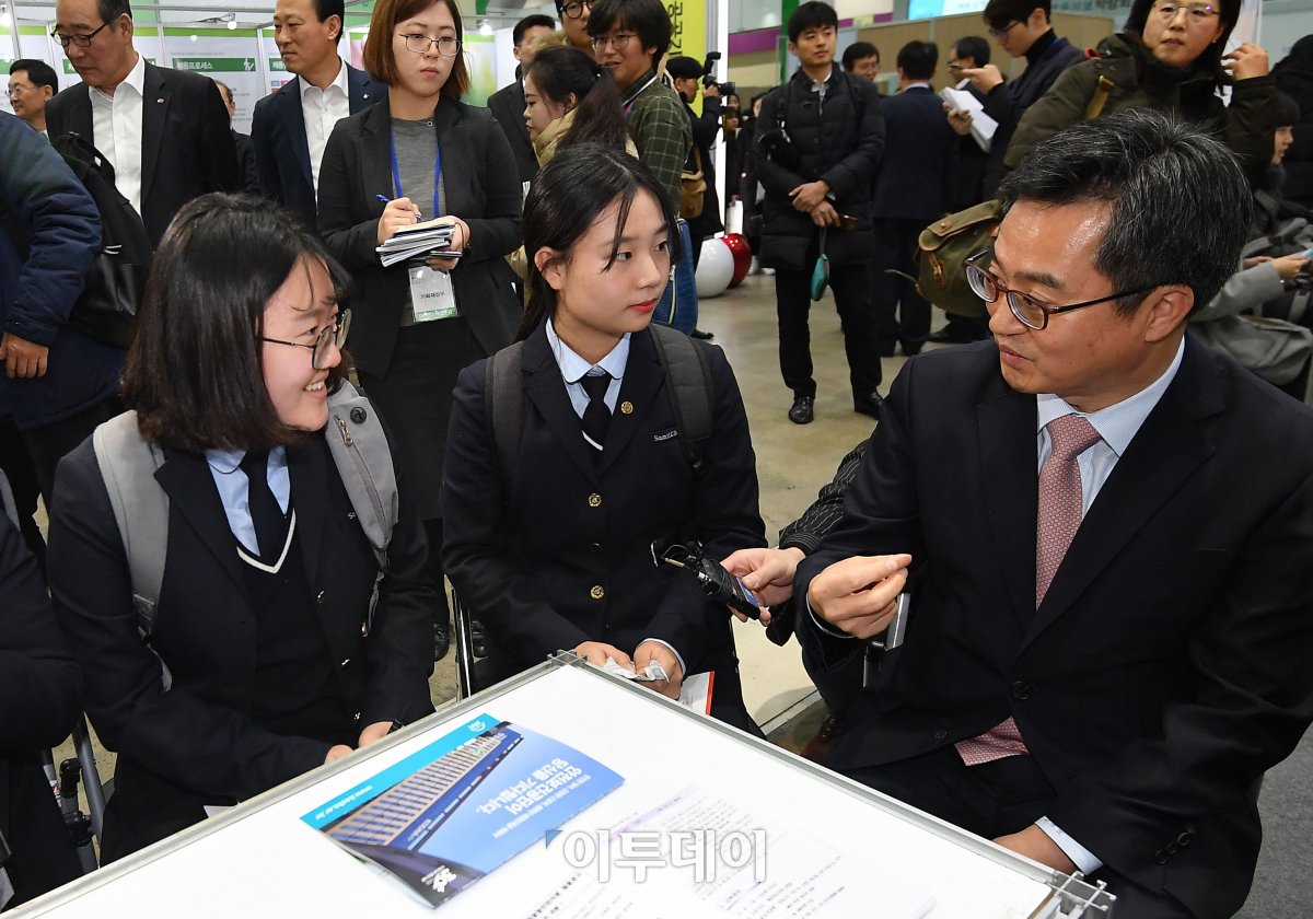 김동연 경제부총리 겸 기획재정부 장관이 20일 서울 강남구 코엑스에서 열린 2017 공공기관 채용정보 박람회에서 채용상담 중인 학생들을 격려하고 있다. 정부가 마련한 이번 박람회는 한전, 인천국제공항공사, 중소기업은행 등 120여개 주요 공공기관이 참여, 청년 구직자들에게 기관 업무 설명과 채용상담 등의 기회를 제공한다.이동근 기자 foto@