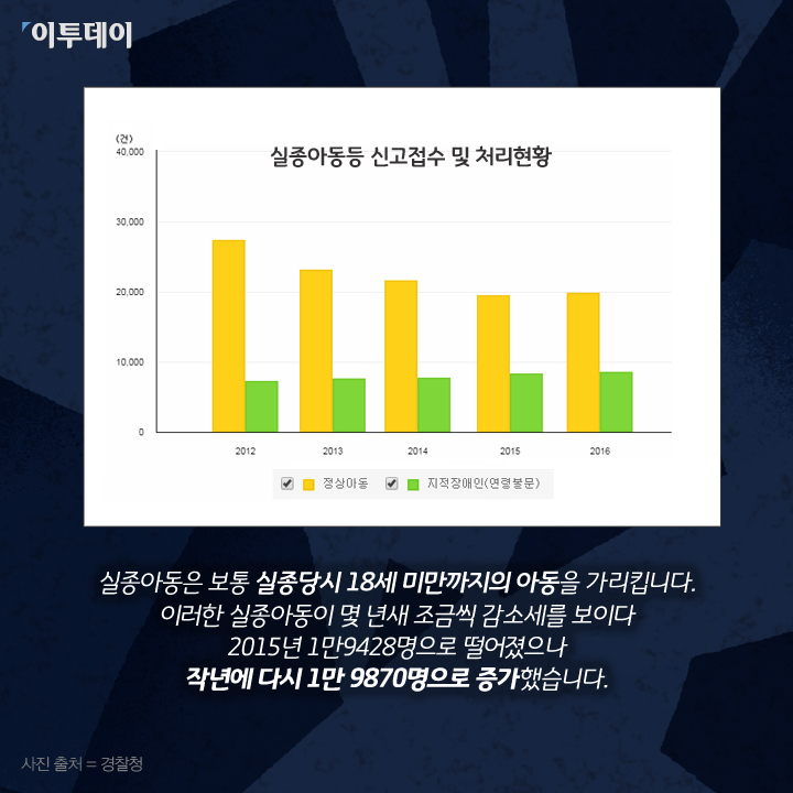 이러한 실종아동이 몇 년새 조금씩 감소세를 보이다 2015년 1만9428명으로 떨어졌으나 작년에 다시 1만 9870명으로 증가했습니다.