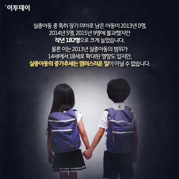 실종아동 중 특히 장기 미아로 남은 아동이 2013년 0명, 2014년 5명, 2015년 9명에 불과했지만 작년 182명으로 크게 늘었습니다.