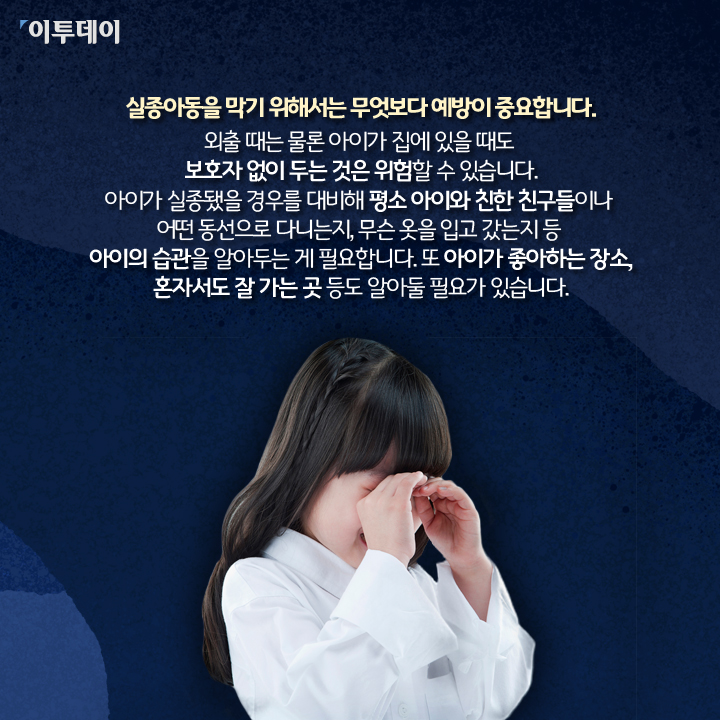 아이가 실종됐을 경우를 대비해 평소 아이와 친한 친구들이나 어떤 동선으로 다니는지, 무슨 옷을 입고 갔는지 등 아이의 습관을 알아두는 게 필요합니다.