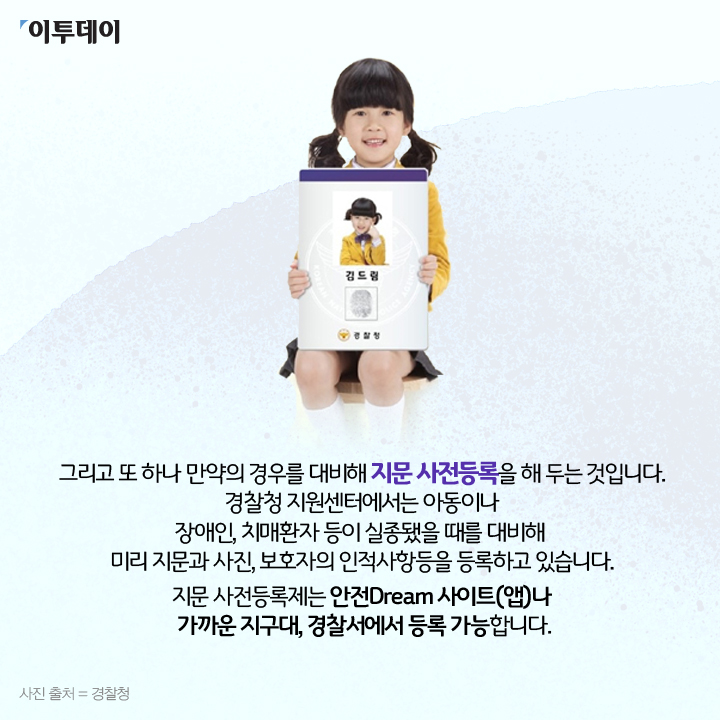 지문 사전등록제는 안전Dream 사이트(앱)나 가까운 지구대, 경찰서에서 등록 가능합니다.