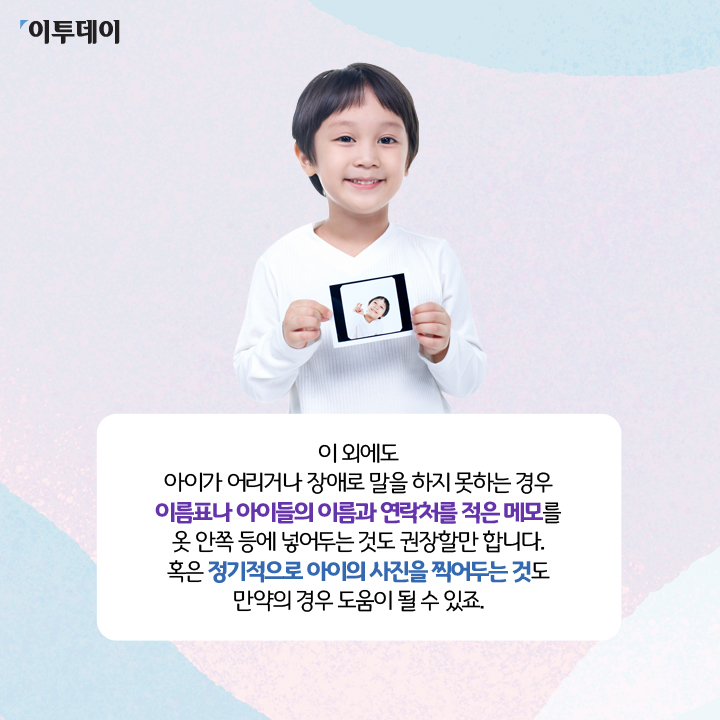 아이가 어리거나 장애로 말을 하지 못하는 경우 이름표나 아이들의 이름과 연락처를 적은 메모를 옷 안쪽 등에 넣어두는 것도 권장할만 합니다.
