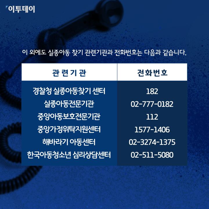 이 외에도 실종아동 찾기 관련기관과 전화번호는 다음과 같습니다.