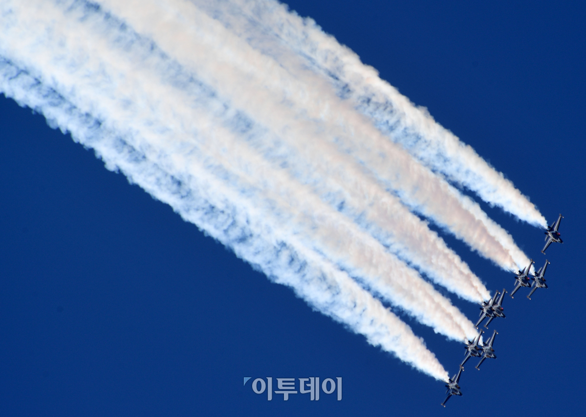 2018평창동계올림픽을 50일 앞둔 21일 강원 평창군 알펜시아 경기장 상공에서 공군 특수비행팀 블랙이글스가 곡예 비행을 펼치고 있다. 이동근 기자 foto@