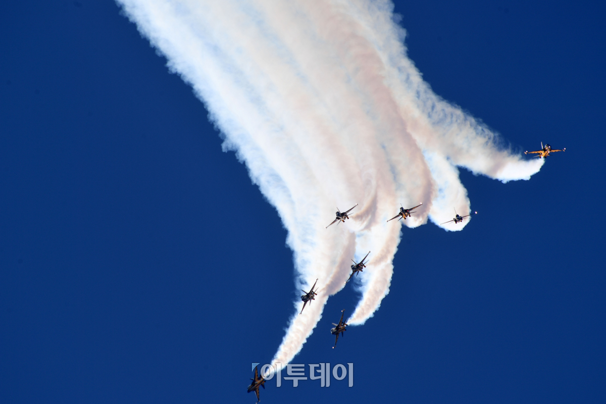 2018평창동계올림픽을 50일 앞둔 21일 강원 평창군 알펜시아 경기장 상공에서 공군 특수비행팀 블랙이글스가 곡예 비행을 펼치고 있다. 이동근 기자 foto@