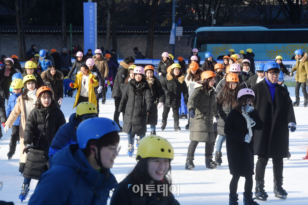 동장군이 엄습한 25일 서울광장 스케이트장을 찾은 시민들이 크리스마스 연휴를 즐기고 있다. 이동근 기자 foto@