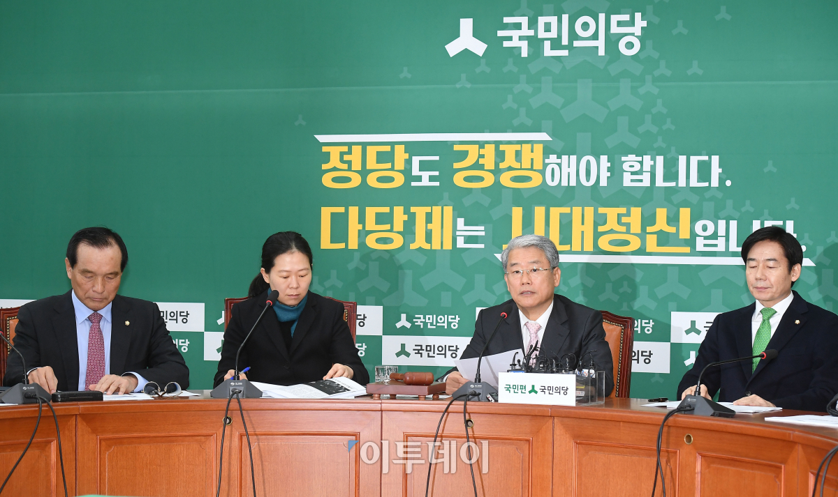 김동철(오른쪽에서 두 번째) 국민의당 원내대표가 26일 오전 서울 여의도 국회에서 열린 원내대책회의에서 모두발언을 하고 있다. 이동근 기자 foto@