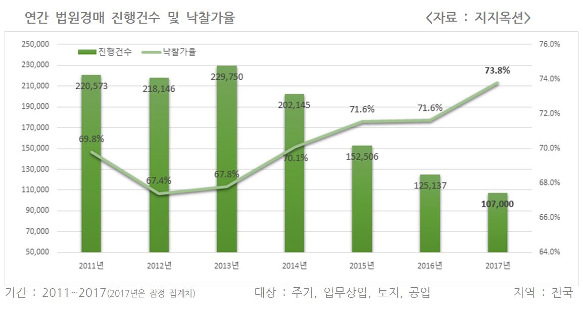 26일 지지옥션에 따르면 2017년 경매 진행건수는 10만7000여 건, 평균낙찰가율은 73.8%로 나타났다. 진행건수는 2014년 이후 4년째 갱신된 역대 최저치이며, 평균낙찰가율은 2012년 67.4%로 저점을 찍은 이후 6년째 상승을 이어가고 있다. 특히 올해는 역대 최고치인 2007년의 72.6%를 넘어서 처음으로 74% 낙찰가율을 기록했다.