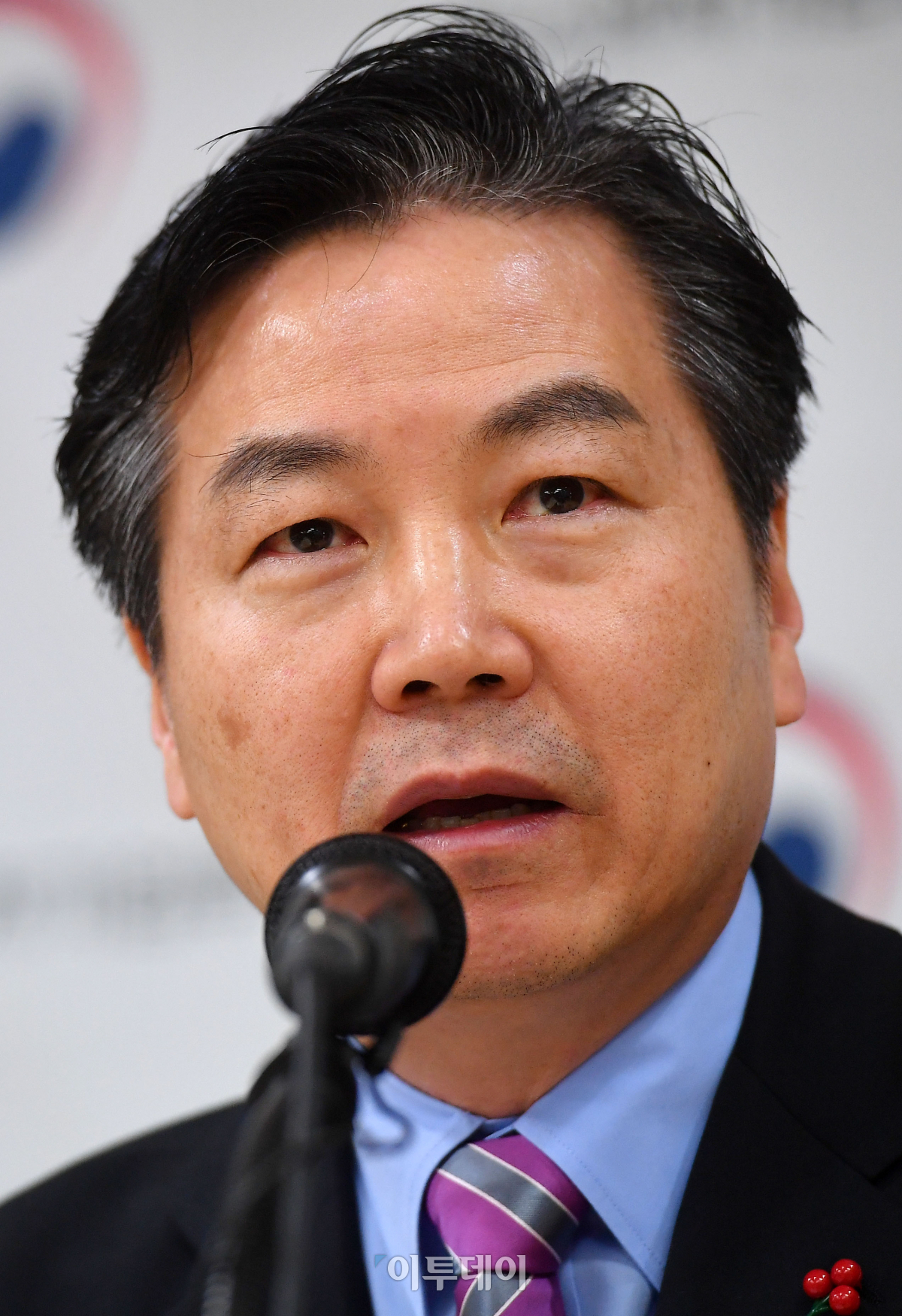 홍종학 중소벤처기업부 장관이 26일 서울 여의도 중소기업중앙회에서 2018년도 중소기업 정책자금 운용계획 발표 후 취재진의 질문에 답하고 있다. 이동근 기자 foto@