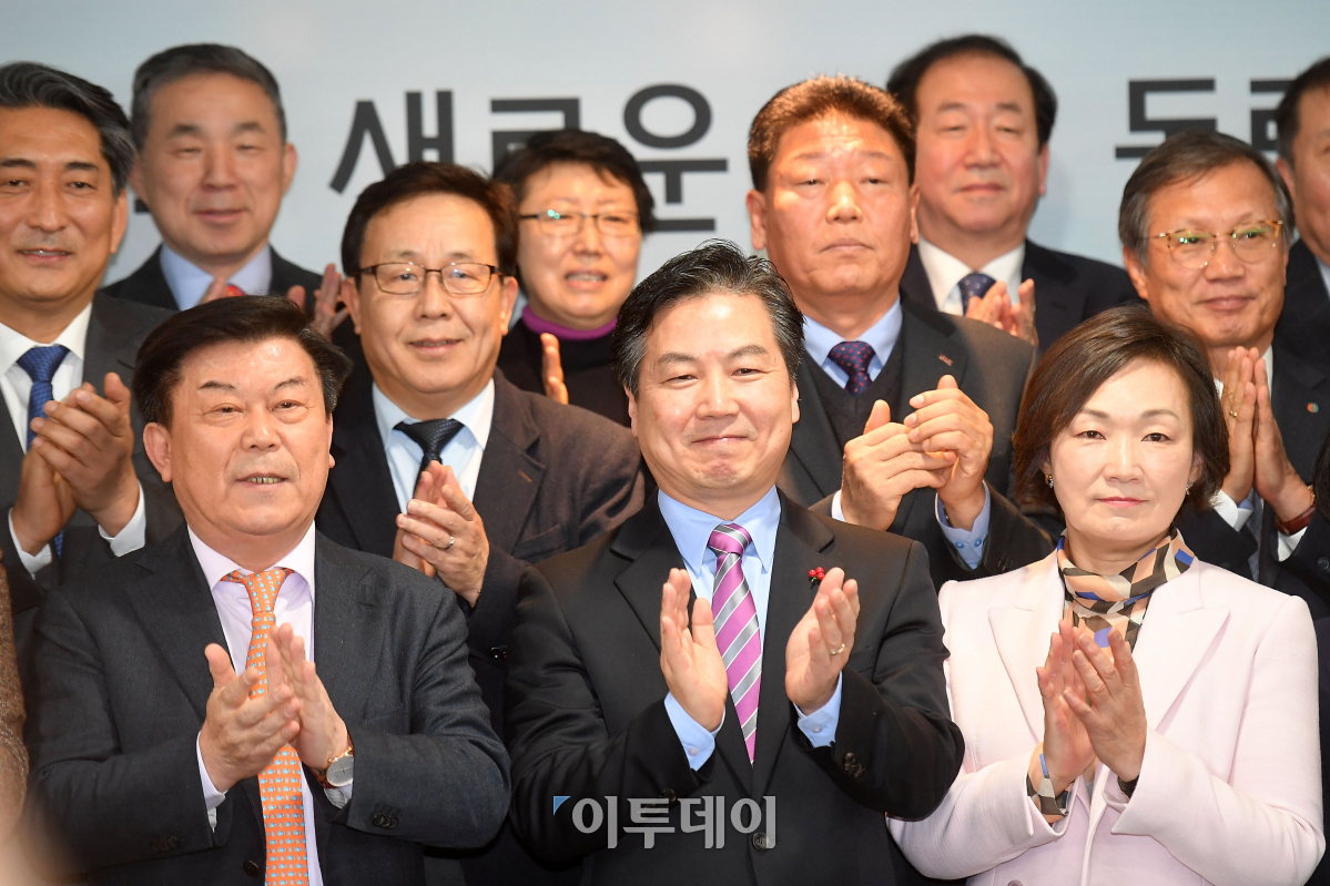 홍종학(앞줄 가운데) 중소벤처기업부 장관이 26일 서울 영등포구 중소기업중앙회에서 열린 중소기업인 간담회에서 참석자들과 기념촬영을 하며 박수치고 있다. 이동근 기자 foto@