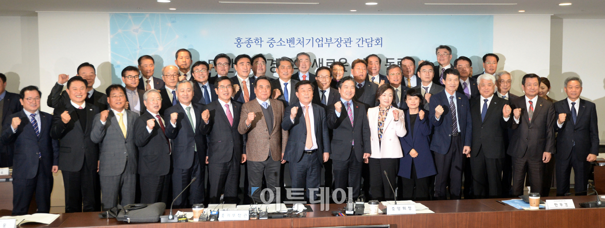 홍종학(앞줄 오른쪽에서 일곱번째) 중소벤처기업부 장관이 26일 서울 영등포구 중소기업중앙회에서 열린 중소기업인 간담회에서 참석자들과 기념촬영을 하며 박수치고 있다. 이동근 기자 foto@
