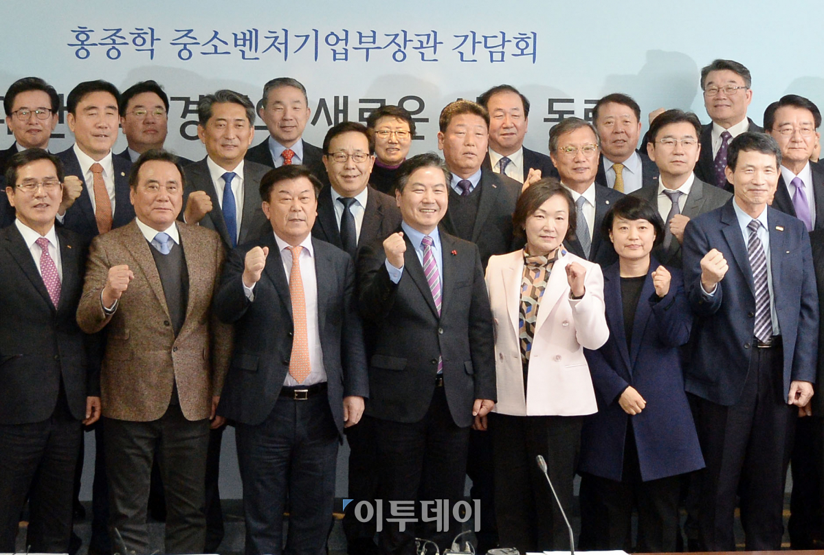홍종학(앞줄 가운데) 중소벤처기업부 장관이 26일 서울 영등포구 중소기업중앙회에서 열린 중소기업인 간담회에서 참석자들과 기념촬영을 하고 있다. 이동근 기자 foto@